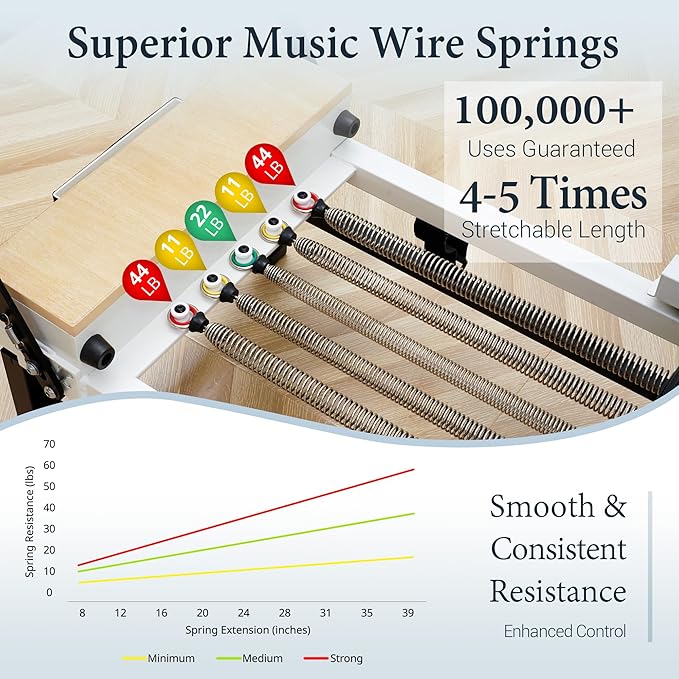 - Ultimate Stability and Comfort:Our details produce your results. The pilates reformer machine supports up to 500 lbs with six sturdy legs for enhanced stability. Enjoy premium piano wire springs for smooth, silent operation, designed for over 50,000 uses. The high-density foam padding ensures lasting comfort and support, while ultra-smooth tracks and quiet PU wheels provide effortless gliding. Elevate your pilates practice with our top-of-the-line reformer!