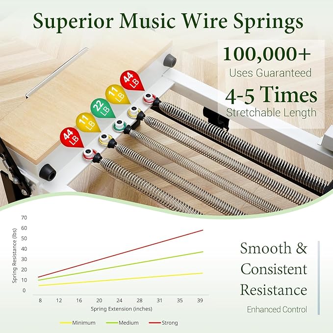- Ultimate Stability and Comfort:Our details produce your results. The pilates reformer machine supports up to 500 lbs with six sturdy legs for enhanced stability. Enjoy premium piano wire springs for smooth, silent operation, designed for over 50,000 uses. The high-density foam padding ensures lasting comfort and support, while ultra-smooth tracks and quiet PU wheels provide effortless gliding. Elevate your pilates practice with our top-of-the-line reformer!