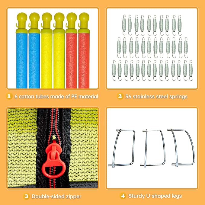 - 👉【INSTALLATION PRECAUTIONS】-1. After the zipper part of the mesh is wrinkled when installing the mesh, the rope at the bottom of the mesh can be tied to the triangle buckle connected by the spring and the jump cloth, so that the mesh will be tightened and the zipper will become flat. 2. When installing six guardrails, you can assemble five guardrails first, and then install the last guardrail after inserting the mesh.