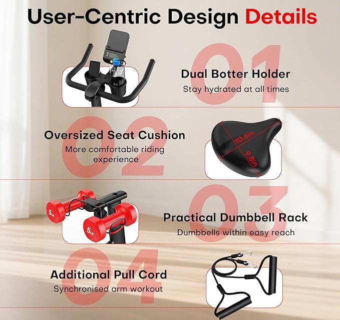 - [User-Focused Design Details]: This indoor bike trainer comes with a unique dumbbell rack for convenient storage (Note: dumbbells not included). The water bottle holder has been upgraded from 1 to 2, allowing you to store bottles, towels, or mobile phones etc. Attach the 2pcs arm resistance bands to the bike for simultaneous arm training while cycling. Quality you can trust —Every detail of our exercise bikes!