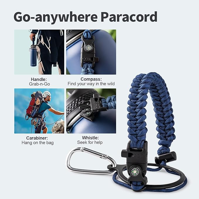 - Palm Fitting Paracord Handle: Compared to handle lids, nylon paracord on the bottle gives you more choices in terms of color coordination and coziness on your hands. Match the handle with your bottle to make a complete outdoorsy look. Compass and carabiner can be lifesavers for hiking and other expeditions