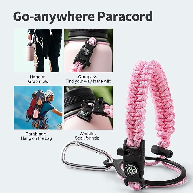 - Palm Fitting Paracord Handle: Compared to handle lids, nylon paracord on the bottle gives you more choices in terms of color coordination and coziness on your hands. Match the handle with your bottle to make a complete outdoorsy look. Compass and carabiner can be lifesavers for hiking and other expeditions