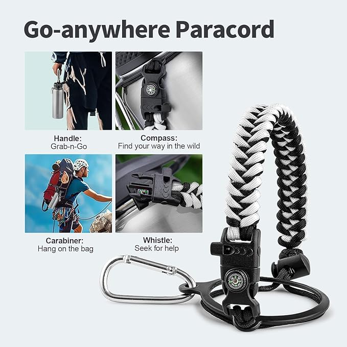 - Palm Fitting Paracord Handle: Compared to handle lids, nylon paracord on the bottle gives you more choices in terms of color coordination and coziness on your hands. Match the handle with your bottle to make a complete outdoorsy look. Compass and carabiner can be lifesavers for hiking and other expeditions