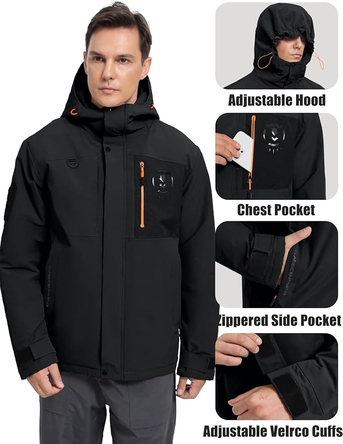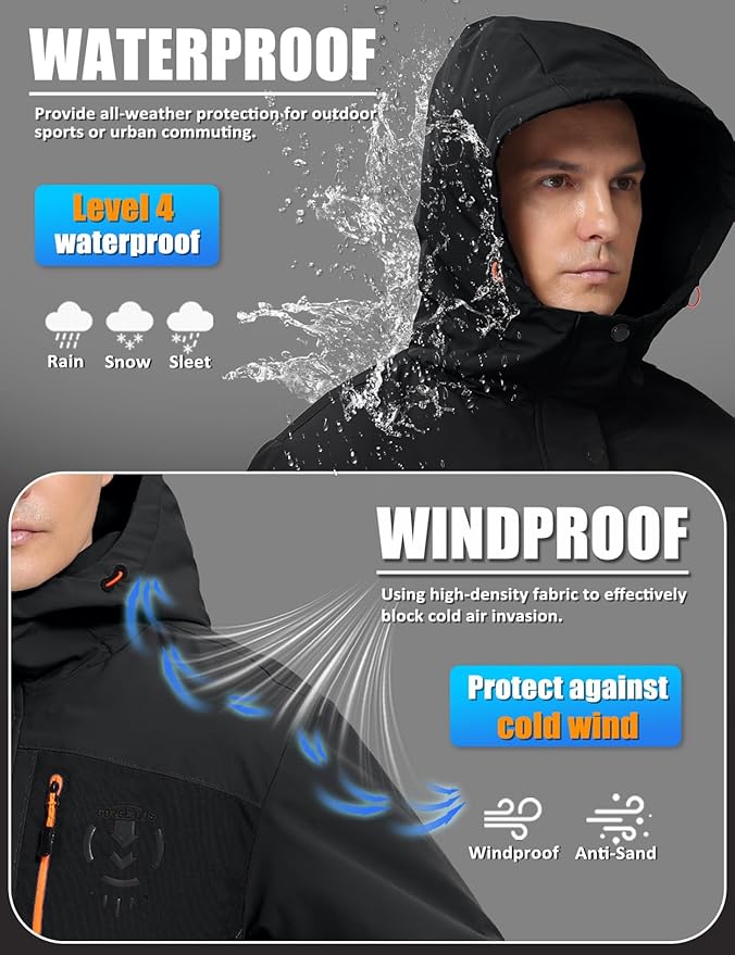 • Waterproof & Windproof:Constructed with high-performance 4-level protective fabric, this men's ski jacket provides superior resistance against wind and water. Whether you're skiing down slopes or navigating daily commutes in rain or snow, it ensures reliable dryness and comfort in harsh outdoor conditions.