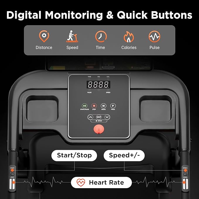 - SMART HANDRAIL & LED DISPLAY: This treadmill with handles features built-in heart rate sensors on the handles - simply place your hands on the contact points for real-time monitoring. The ergonomic handrail integrates speed control buttons for instant adjustments during workouts. A bright LED display clearly tracks time, speed, distance, heart rate, and calories. 12 preset programs provide different intensities of exercise and you can choose customized one with ease