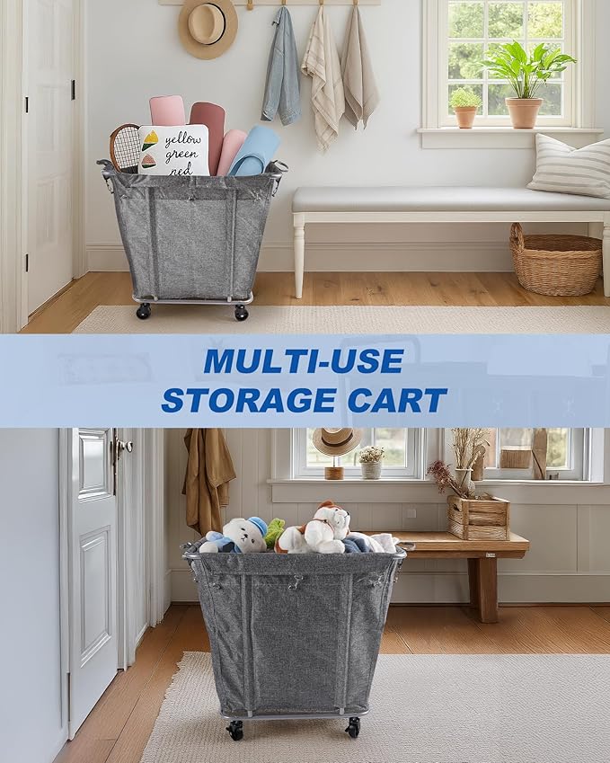 - 【Smooth-Rolling Wheels with Brakes】: Equipped with 4 sturdy 360° swivel wheels (2 lockable), this laundry cart glides effortlessly across floors and stays put when needed. Designed for easy movement, even when fully loaded.