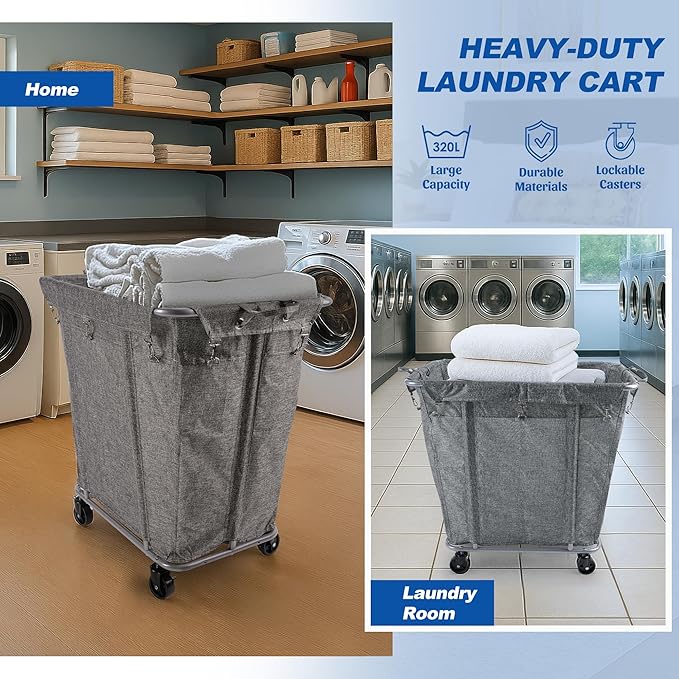PLKOW Laundry Cart with Wheels 320L Large Rolling Laundry Cart for Commercial/Home, Rolling Laundry Basket with Steel Frame and Waterproof Lining, 9 Bushel, 32.3L x 19.7W x 30.7H Inch, Grey