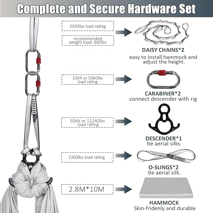 - 【Complete Starter Kit - Everything Included】 Get started right away! Kit includes: 11yd aerial silk fabric, 2 O-rings, 2 daisy chains, 1 connecting ring, 2 nylon slings, and an easy setup guide. Ideal for beginners and experts alike—whether you're into silks for gymnastics, yoga hammock, or aerial yoga swing workouts!