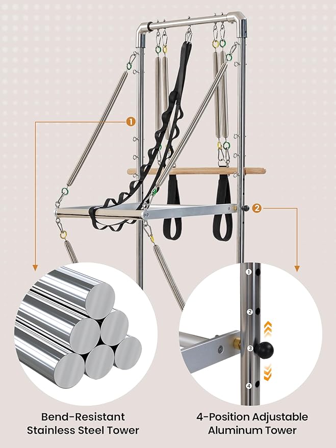 - Exercise Variety: The pilates reformer with tower enables angled strength training, stretching, and rehab exercises. Tower can be easily separated from the reformer with quick-release. The tower has 27 eye bolts for suspension workouts, enabling you and your family to target muscles more precisely than standard reformers