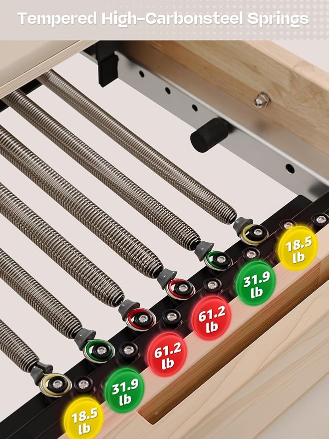 - Safe and Stable: The solid oak frame supports up to 440 lbs, while aluminum rails and secure locking systems offer a stable workout platform. You can focus on your workout without irritation or blisters with Pilates straps padded with fleece
