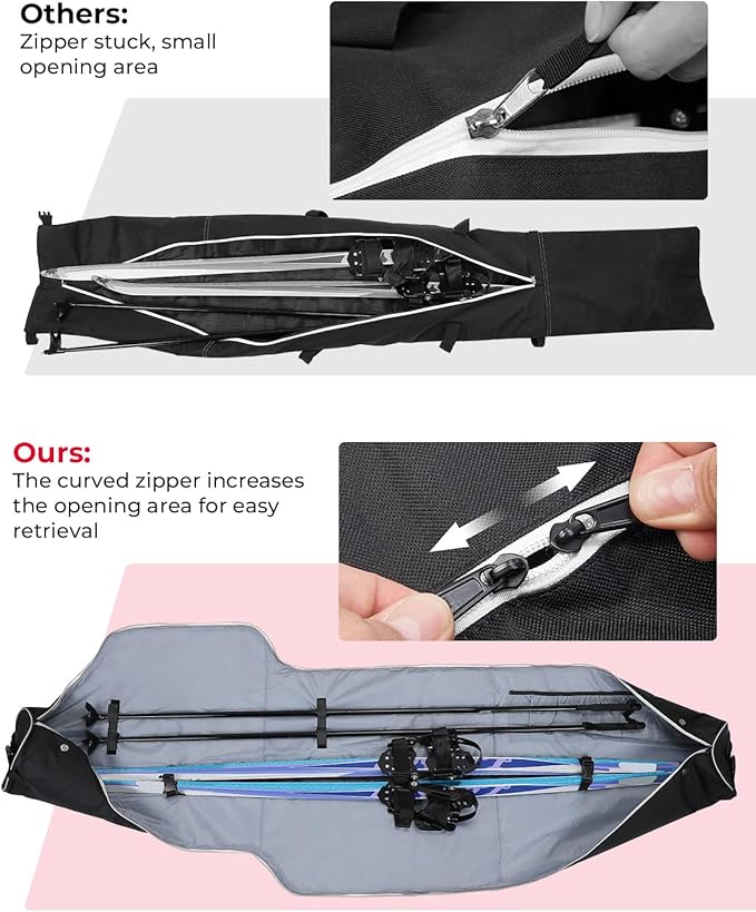 - ERGONOMIC HANDLES AND ZIPPER: Ergonomic carrying handles make carrying your skis a breeze. S-shaped zipper coils around the ski storage bag making loading and retrieving gear simple