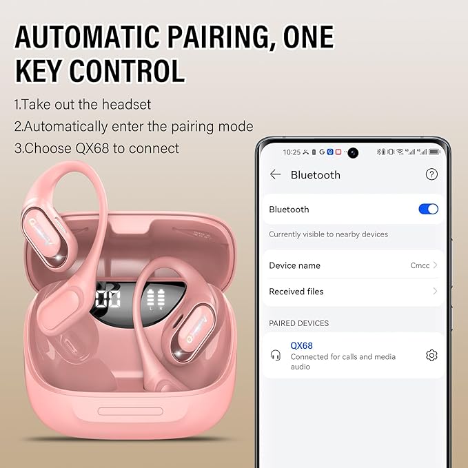 - True Open-Ear Design: QXUFV open ear earbuds are crafted to rest gently around your ears, keeping your ear canals completely open for a truly comfortable and secure fit. Made from ultra-lightweight, skin-friendly materials and weighing just 9.5g, wireless earbuds are so light you can wear them all day without feeling a thing. Say goodbye to ear fatigue and enjoy effortless, all-day comfort.