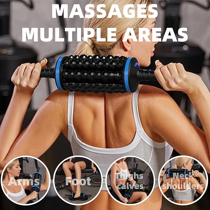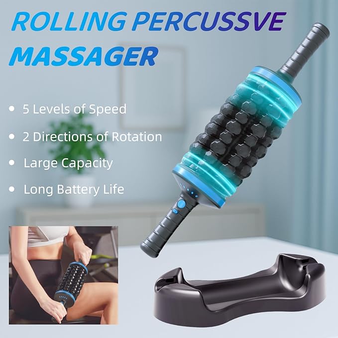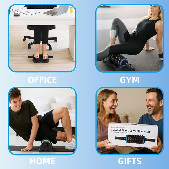 - Hands-Free Base for Effortless Targeting: Rolling Percussive Massager included base allows for convenient, hands-free operation, enabling you to easily address various muscle groups. This makes it one of the most adaptable massage tools available. Effortlessly target areas like thighs, quads, calves, feet, hamstrings, arms, shoulders, back, IT band, and glutes for a truly versatile massage experience.