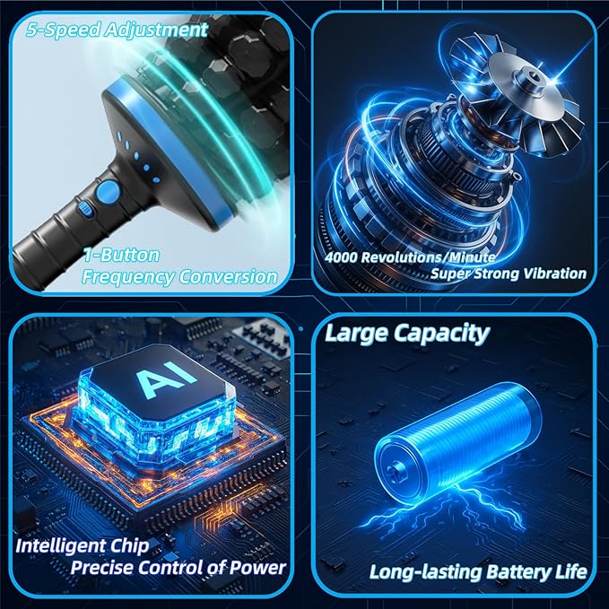 - 5 Massage Intensities with Smart Response:Customize your massage with five adjustable speeds—from light to intense. The built-in responsive system helps adapt power output to different muscle zones, offering a smoother and more personalized massage experience.