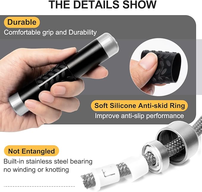 • Comfortable grip, strong practicality:The aluminum handles with silicone grips provide a comfortable, secure hold, while the raised texture ensures non-slip performance during high-intensity workouts. Ideal for Boxing, Double Unders, WOD, MMA, and CrossFit training