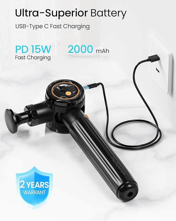 - 【15W PD Fast Charging & USB Type-C Charging】This handheld massage gun supports 15W PD fast charging—it fully charges in just 2.5 hours, compared to 4+ hours for conventional models. The long-life rechargeable battery supports continuous use for over 3+ hours on a single charge. This back massage gun also features auto-shutoff and overheating protection for safe and portable operation.