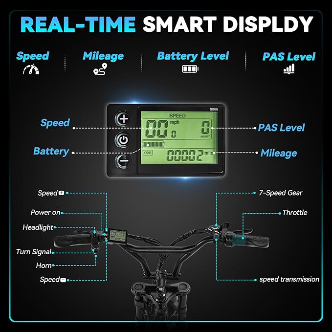 - 【User-Friendly LCD Display & Intuitive Controls】The integrated LCD display provides real-time information including speed, battery level, error alerts, total mileage, and trip distance. Side buttons allow quick adjustments to power, standby time, backlight brightness and so on. Handlebar controls for the headlamp, turn signals, and horn make operation simple and safe, even in low-light conditions.