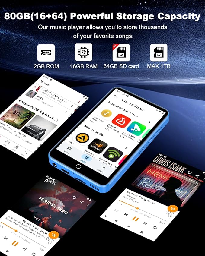 - 🌟All-in-One MP3 Player:ZAQE multi-functional MP3 player comes with Bluetooth and WiFi, plus a rich lineup of pre-installed mainstream media apps—including Apple Music, Spotify, Audible, Amazon Music, Deezer, as well as practical tools like FM Radio, Video Player, Calendar, and Recorder. It meets all your daily needs: listen to music, watch videos, or read e-books online or offline, bringing you more unexpected surprises.
